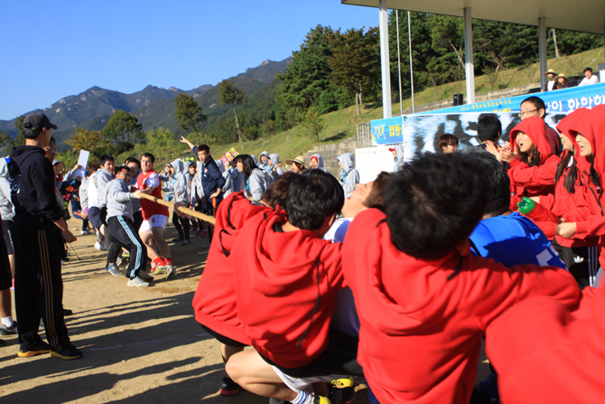 개교 10주년 금강인 화합 한마당 지난 10월 11일 우리 대학교 개교 10주년을 맞아 금강인 화합 한다당 체육대회가 대운동장에서 개최되었다. 오전 9시부터 오후 6시까지 약 9시간동안 전교생과 교직원, 외국인 학생, 그리고 휴학 중인 학생들과 졸업한 선배들까지 참여하여 체육대회는 활기차게 진행되었다. 이번 대회의 슬로건은 ‘개교 10주년 금강인 화합 한마당’ 이었다. 이날 팀은 불사팀(불교학과, 사회복지학과), 행정팀(행정학과), 영국팀(영어통상통역학과, 영어통번역학과, 국제통상학과), 통통회팀(중어통상통역학과, 중어통번역학과, 일어통상통역학과, 일어통번역학과, 회계학과) 총 4개로 나뉘어져 각각의 단체복을 입고 치열한 경기와 열띤 응원전을 펼쳤다. 종목으로는 줄다리기, 여자축구, 장애물달리기, 씨름, 헹가레릴레이, 농구, 족구, 팔씨름, 피구, 차 들어가기, 풍선기둥세우기, 남자축구, 계주가 진행되었다. 체육대회의 종합우승팀은 행정팀으로 상금으로 100만원이 지급되었다. 행정팀에 윤승섭(교양과정, 10) 학우는 “복학하고 첫 체육대회를 참가하게 되었는데, 선후배들과 하나로 단결되는 것이 무척 즐거웠다. 그리고 그동안 보지 못했던 여러 학우들의 박력있고 파이팅한 모습들이 인상 깊었다.”고 말했다. 체육대회의 시상식까지 모두 끝나고, 체육대회에 참가한 인원들은 모두 함께 다목적코트에서 디너타임을 가졌다. 행사를 주관한 배진문(행정학과, 08) 총학생회장은 "외국인 학생을 포함한 전체 학생이 400여명인 '소수정예' 우리 대학교는 교직원 등 전체 구성원이 한 가족처럼 지내고 있다"며 "개교 10주년을 맞아 구성원 간 협동심을 발휘 세계적인 명문대학으로 도약을 위한 화합의 장을 마련하기위해 이번 행사를 준비했다"고 밝혔다. |
